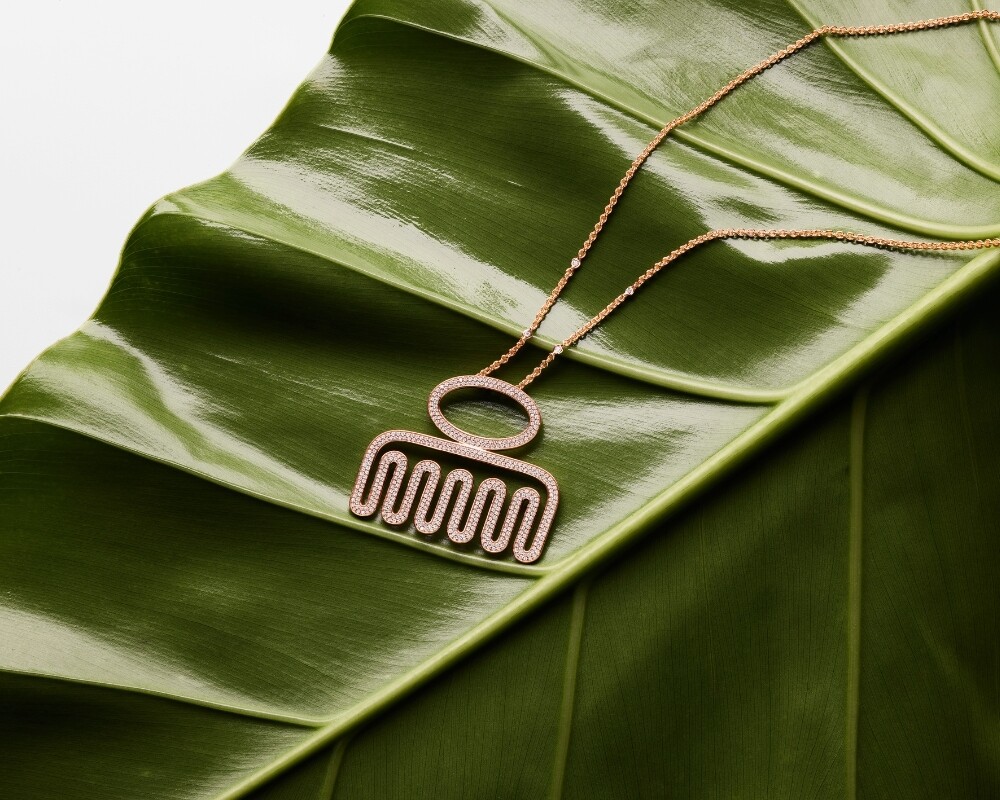 Quand le bijou devient le messager d’une pensée ou d’un sentiment, il se métamorphose en élément de langage. Adinkra se compose d’un alphabet de symboles dont chaque motif, porté en pendentif, dit la beauté, l’endurance, le pouvoir, l’amour, la réconciliation ou encore la protection des Dieux. En or surlignés de diamants, ces mots visuels sont la réminiscense éclatante de la sagesse africaine.