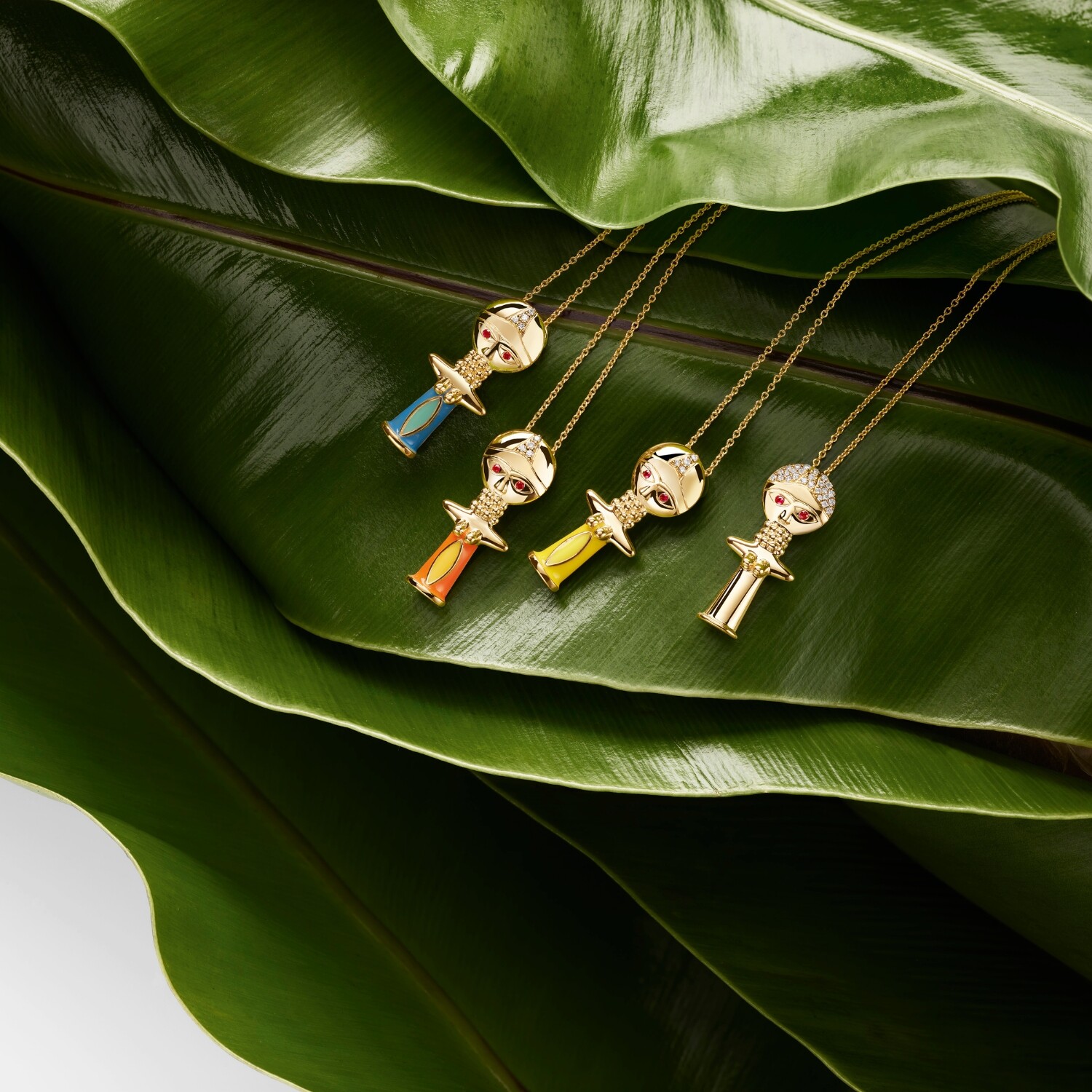 Les poupées Ashanti, symboles connus de l'art populaire africain, deviennent de sensuels pendentifs habillés de diamants et de pierres précieuses.
