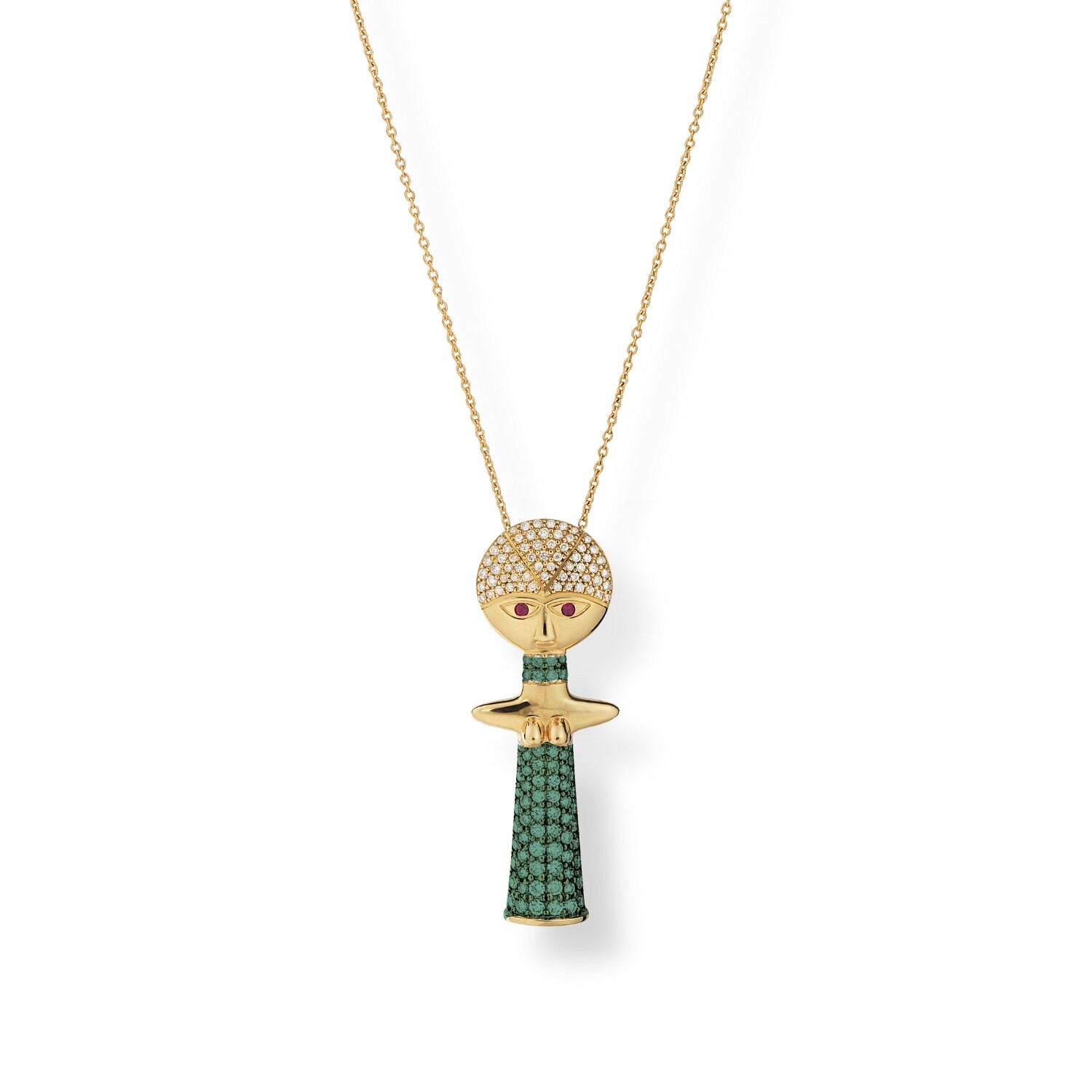 Les poupées Ashanti, symboles connus de l'art populaire africain, deviennent de sensuels pendentifs habillés de diamants et de pierres précieuses.
